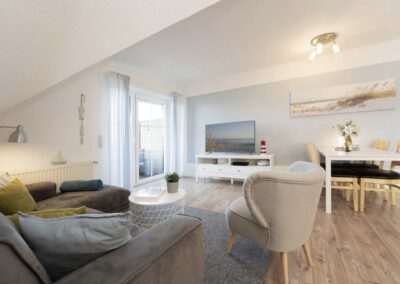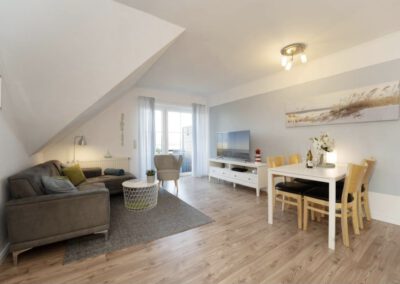 Im gemütlichen Wohnbereich laden ein bequemes Sofa und ein Sessel zum Entspannen vor dem Fernseher ein. Vom Wohnraum gelangen Sie direkt auf den sonnigen Balkon mit Süd-West-Ausrichtung – der perfekte Ort, um die frische Meeresluft zu genießen.